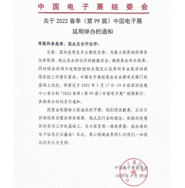 當(dāng)前,國內(nèi)疫情呈多點(diǎn)頻發(fā)態(tài)勢,為最大限度地保障各位參展商、觀眾及合作伙伴的健康安全,確保展會(huì)舉辦效果,同時(shí)結(jié)合深圳市疫情防控相關(guān)規(guī)定以及深圳市會(huì)展活動(dòng)疫情防控工作指引要求,中國電子展組委會(huì)在會(huì)商有關(guān)部門的基礎(chǔ)上決定,將原定于2022年5月17日-19日在深圳會(huì)展中心舉辦的“2022春季(第99屆)中國電子展”延期舉行,具體舉辦時(shí)間,另行通知。因展會(huì)延期給大家造成的不便,我們深表歉意。主辦方將繼續(xù)秉承服務(wù)好參展商、觀眾及行業(yè)的理念,在做好疫情防控各項(xiàng)工作的基礎(chǔ)上,為大家呈現(xiàn)一場高質(zhì)量、高水準(zhǔn)的電子信息行業(yè)盛會(huì)!在此,衷心感謝業(yè)界同仁對(duì)我們一如既往的關(guān)注與支持。