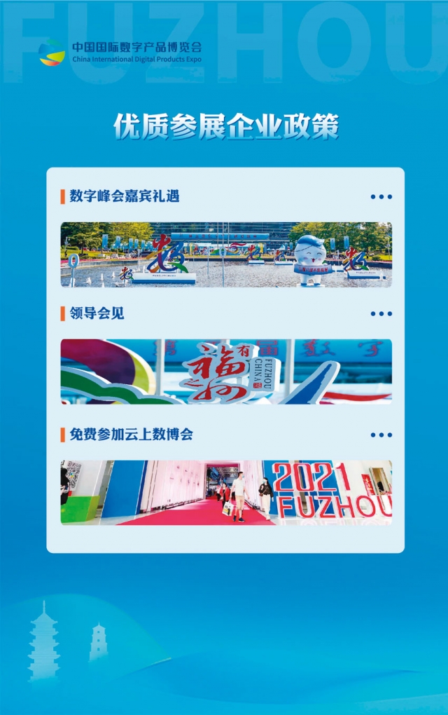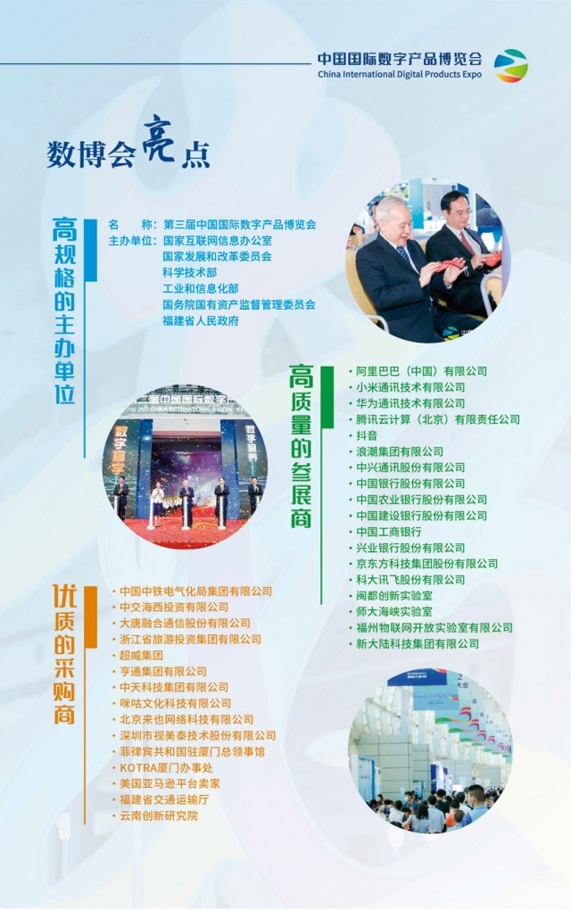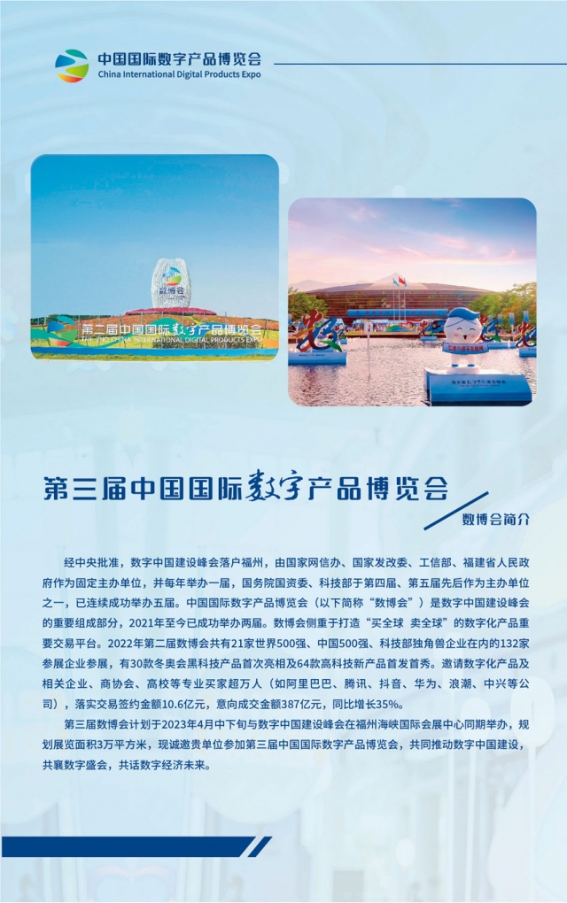 第三屆中國國際數(shù)字產(chǎn)品博覽會計劃于2023年4月中下旬在福州海峽國際會展中心舉辦,規(guī)劃展覽面積3萬平方米,現(xiàn)誠邀貴單位參加第三屆中國國際數(shù)字產(chǎn)品博覽會,共同推動數(shù)字中國建設(shè),共襄數(shù)字盛會,共話數(shù)字經(jīng)濟(jì)未來。