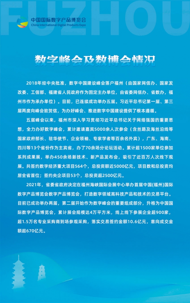 2018年經(jīng)中央批準(zhǔn),數(shù)字中國建設(shè)峰會落戶福州(由國家網(wǎng)信辦、國家發(fā)改委、工信部、福建省人民政府作為固定主辦單位,由省委網(wǎng)信辦、省數(shù)辦,福州市作為承辦單位)。目前,已連續(xù)成功舉辦五屆。習(xí)近平總書記第一屆、第三屆兩度向峰會致賀信,為辦好峰會、推進(jìn)數(shù)字中國建設(shè)提供了根本遵循。