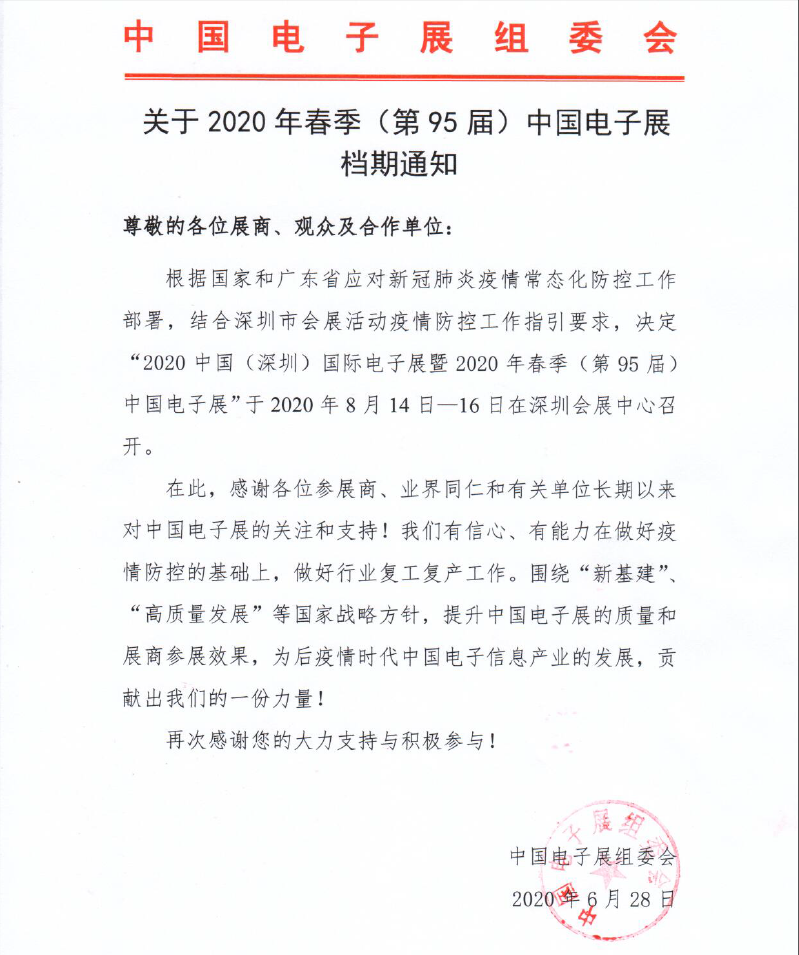 關于2020年春季(第95屆)中國電子展開展時間通知
