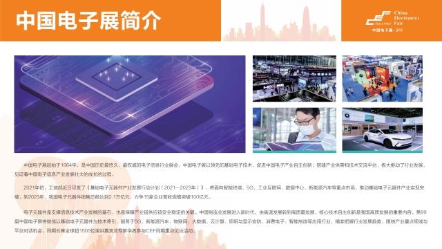 中國(guó)電子展起始于1964年,是中國(guó)歷史最悠久、最權(quán)威的電子信息行業(yè)展會(huì)。中國(guó)電子展以領(lǐng)先的基礎(chǔ)電子技術(shù),促進(jìn)中國(guó)電子產(chǎn)業(yè)自主創(chuàng)新;搭建產(chǎn)業(yè)供需和技術(shù)交流平臺(tái),極大推動(dòng)了行業(yè)發(fā)展,見(jiàn)證著中國(guó)電子信息產(chǎn)業(yè)發(fā)展壯大的成長(zhǎng)的過(guò)程。