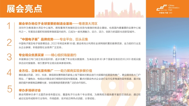 電子元器件是支撐信息技術(shù)產(chǎn)業(yè)發(fā)展的基石,也是保障產(chǎn)業(yè)鏈供應(yīng)鏈安全穩(wěn)定的關(guān)鍵。中國(guó)制造業(yè)發(fā)展進(jìn)入新時(shí)代,由高速發(fā)展轉(zhuǎn)到高質(zhì)量發(fā)展,核心技術(shù)自主創(chuàng)新是我國(guó)高質(zhì)發(fā)展的重要內(nèi)容。第99屆中國(guó)電子展將繼續(xù)以基礎(chǔ)電子元器件為技術(shù)牽引,服務(wù)于5G、新能源汽車、物聯(lián)網(wǎng)、大數(shù)據(jù)、云計(jì)算、照明與顯示安防、消費(fèi)電子、智能制造等應(yīng)用行業(yè),精準(zhǔn)把握行業(yè)發(fā)展趨勢(shì),圍繞產(chǎn)業(yè)重點(diǎn)領(lǐng)域與平臺(tái)對(duì)話機(jī)會(huì)。同期云集全球超1500位演講嘉賓及專家學(xué)者參與CEF同期重點(diǎn)論壇活動(dòng)。