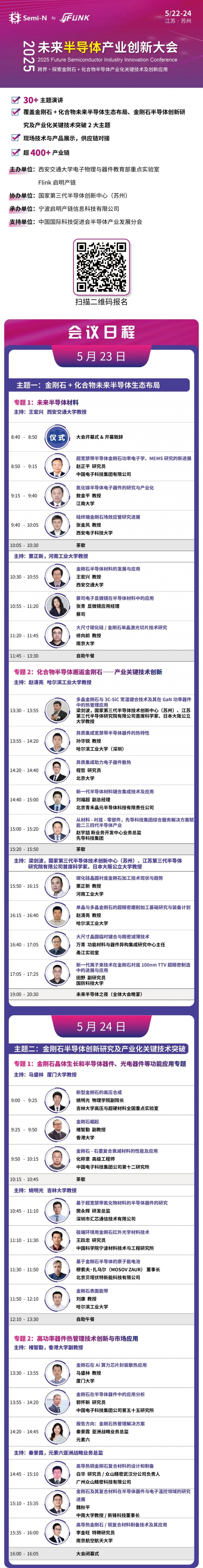 在此背景下,“2025 未來半導體產業創新”大會將于5月22日至24日在江蘇蘇州(吳中希爾頓逸林酒店)盛大召開。本次大會由國家第三代半導體創新中心(蘇州)、西安交通大學、Flink 啟明產鏈聯合舉辦。